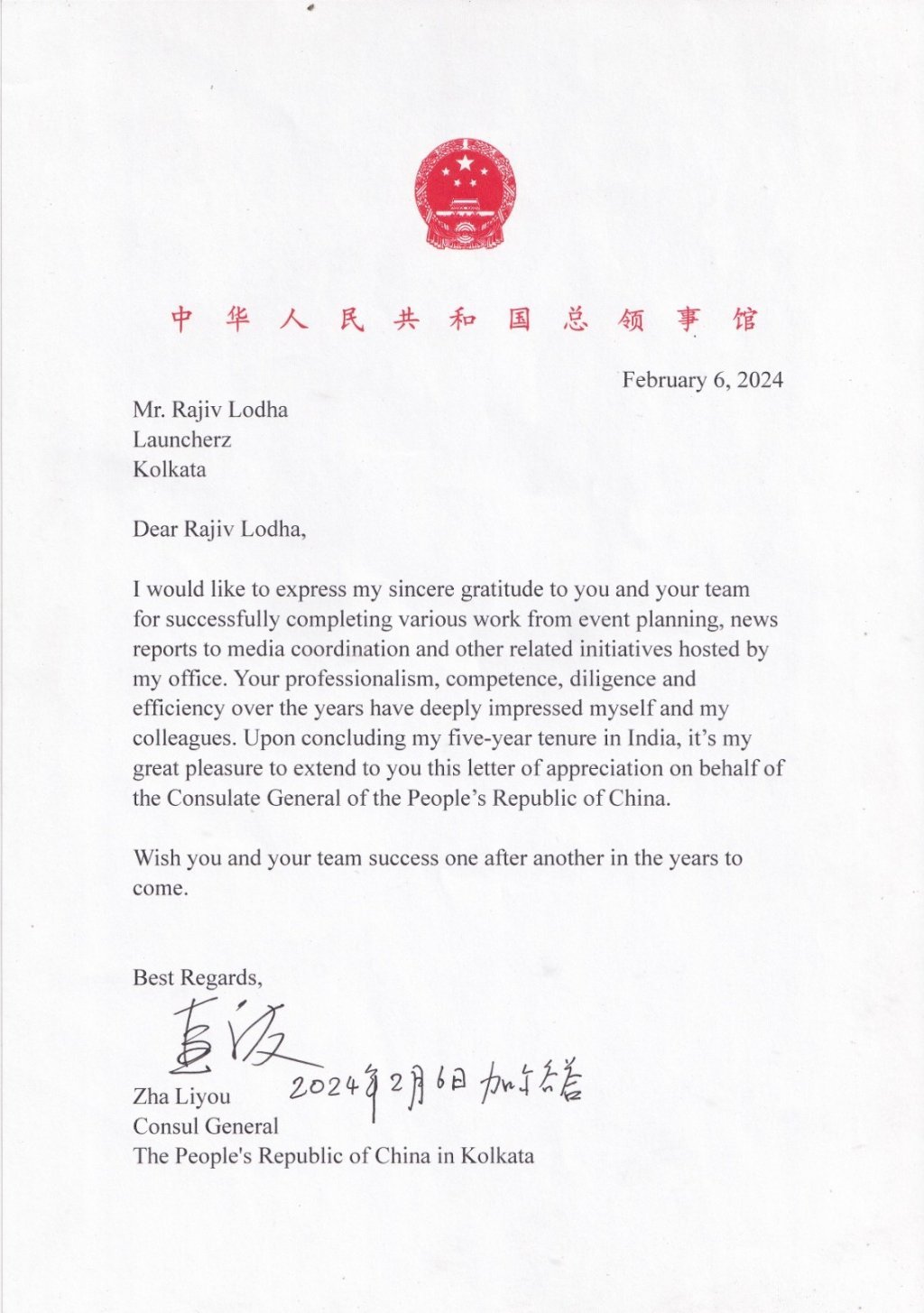 I would like to express my sincere gratitude to you and your team for completing various work from event planning, news reports, to media coordination and other related initiatives hosted by my office. Your professionalism, competence, diligence, and efficiency over the years have deeply impressed my colleagues. Upon concluding my five-year tenure in India, it's my great pleasure to extend to you this letter of appreciation on behalf of the Consulate General of the People's Republic of China. Wish you and your team success one after another in the years to come. Best Regards.